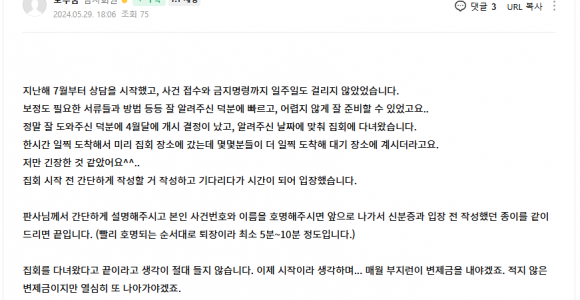 집회 다녀왔습니다. 지난해 7월부터 상담을 시작했고, 사건 접수와 금지명령까지 일주일도 걸리지 않았었습니다. 보정도 필요한 서류들과 방법 등등 잘 알려주신 덕분에 빠르고, 어렵지 않게 잘 준비할 수 있었고요.. 정말 잘 도와주신 덕분에 4월달에 개시 결정이 났고, 알려주..