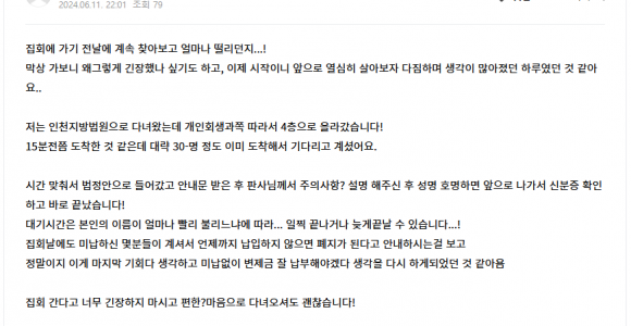 집회참석 후기입니당 집회에 가기 전날에 계속 찾아보고 얼마나 떨리던지...!막상 가보니 왜그렇게 긴장했나 싶기도 하고, 이제 시작이니 앞으로 열심히 살아보자 다짐하며 생각이 많아졌던 하루였던 것 같아 요..저는 인천지방법원으로 다녀왔는데 개인회생과쪽 따라서 4층으로 올라갔습니다!..