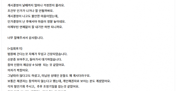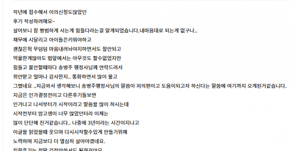 후기입니다^^ 작년에 접수해서 이의신청도많았던후기 작성하려해요~살아보니 참 평범하게 사는게 힘들다라는걸 알게되었습니다.내마음대로 되는게 없구나..채무에 시달리고 아이들은키워야하고괜찮은척 무덤덤 마음내려놔야지하면서도 잘안되고 억울한게많아도 법앞에서는 아무것도 할수없었지만&nb..