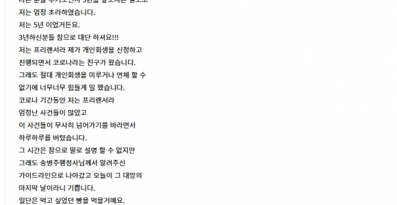 SeoY 제목 그대로 입니다.오늘이 드디어 끝 입니다.다른 분들 후기보면서 3년을 갚으시는 걸보고저는 엄청 초라하였습니다.저는 5년 이었거든요.3년하신분들 참으로 대단 하셔요!!!저는 프리랜서라 제가 개인회생을 신청하고진행되면서 코로나라는 친구가 왔습니다.그래도 절대 개인회생을..