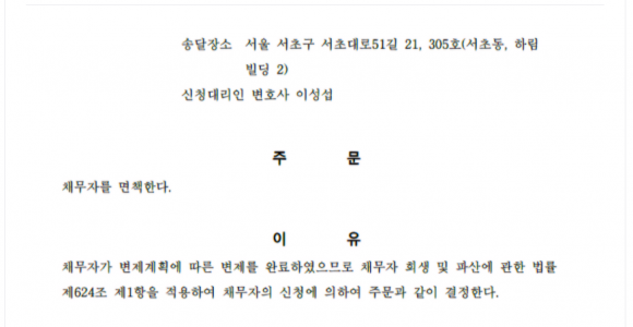 처음부터 끝까지 책임져 주셔서 감사합니다. 모두가 안된다고 했던 상황에서 시작부터 이렇게 면책결정서까지 책임지고 마무리 해 주셔서 다시한번 감사드립니다.점심 먹는 중에 카톡으로 보내주셨는데 눈물 참느라 혼났네요. 지옥같은 시간에서 그래도 살아갈만한 삶을 선물해주셔서 와이즈로 직원 및 행정사님, 변호사님..