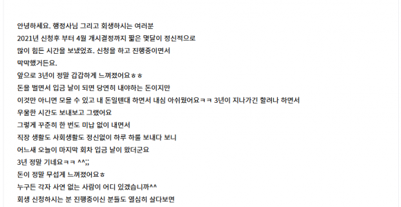마지막 회차 입금을 하고~ 안녕하세요. 행정사님 그리고 회생하시는 여러분2021년 신청후 부터 4월 개시결정까지 짧은 몇달이 정신적으로많이 힘든 시간을 보냈었죠. 신청을 하고 진행중이면서막막했거든요.앞으로 3년이 정말 갑갑하게 느껴졌어요ᄒᄒ돈을 벌면서 입금 날이 되면 당연히 내야하는 돈이지만이것..