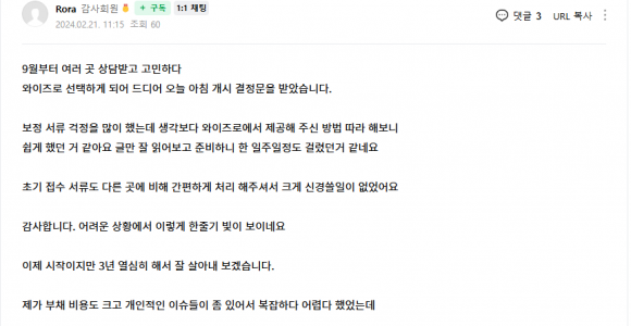 개시결정 받았습니댱! 금전적으로 너무 힘들어 여러곳을 알아보다가 와이즈로라는 곳을 알게 되었고 23년 10에 문의드리고 카톡으로 이야기를 나누다 가 믿음이 잘 가도록 상담을 도와주셔서 와이즈로와 함께 하기로 바로 결정을 했습니다!접수 이후에 사건번호와 금지명령까지는 금방 진행되어 ..